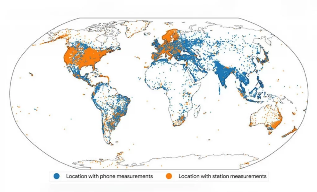 Google’s method of harnessing mobile data has greatly expanded coverage, particularly in areas of India and Eastern Europe where there is a lack of monitoring stations. In the image, the blue dots show about 100,000 locations around the world where a sufficient number of telephone measurements were available to help map the ionosphere.