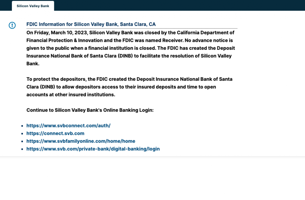 Customers who visit the SVB website are informed that the bank was closed by the California Department of Financial Protection & Innovation.